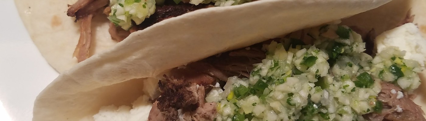 It’s a simple salsa, basically a bunch of garlic, onion, some cilantro, a serrano chile, orange and lemon juice, and a splash of mezcal. I’m not exactly sure why it’s called a “mojito” salsa when it’s got more in common with a margarita, but it’s listed as such in this Salsas and Moles cookbook (which is my new favorite cookbook), so I’m not going to question it. And, this salsa is fantastic. FANTASTIC. The combination of garlic, lime, and cilantro is magical. It’s magnificent with the pork, and the citrus juice cuts pairs well against the queso. You might notice it’s a flour tortilla. Yes, it is. These were a quick fix, and I won’t apologize for it. I was just planning on having the two, but I needed to make another round of two of these, they were so good.