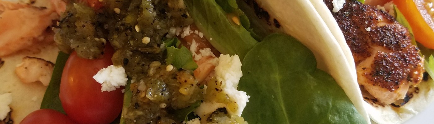Spiced up and pan seared. Not too well done, just enough to get a crust on the salmon. Then lettuce, onion, tomato, queso fresco, and tomatillo salsa. I toasted a couple flour tortillas on a burner. This works better on a gas range than electric, but it still gets a good char. Very fresh, light flavors. It’s great. So great. This blackened salmon is going to get put into the regular salmon recipe rotation. Maybe with the salad on the side, but why not eat it in taco form?
